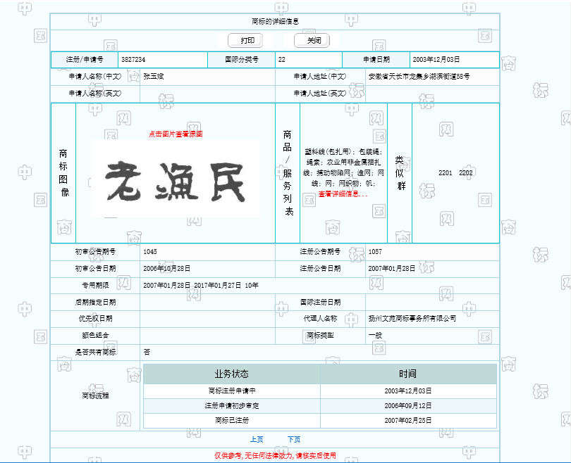 我司在2007年注册了“老渔民”文字;在2011年注册了“老渔民”图案商标。